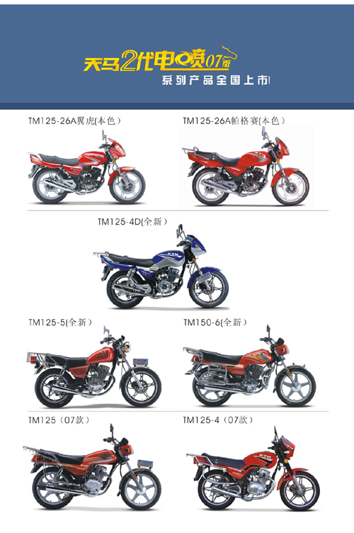 天马二代电喷(07版)车型也更加丰富,涵盖了天马“本色系列”、“全新系列”、“07款系列”,包括了TM125-26A(翼虎)、TM125-26A(帕格赛)、TM125-4D(刀神)、TM125-5、TM150-6、TM125、TM125-4等型号的车型。