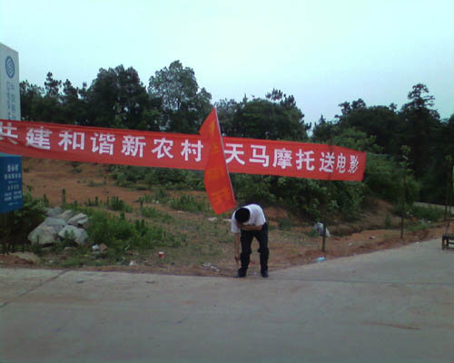 5月23日,天马摩托送电影工作组来到了长沙县黄花镇回龙银龙村,长沙县黄花新一代天马摩托车城的老板彭彪也亲自开车前往今日的放电影地点——长沙县黄花镇回龙银龙村监督放电影工作的执行,并要求工作人员提前在该村附近的路口都挂起了天马放电影的宣传横幅。