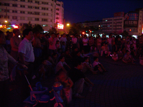 7点30分后,随着赵本山大叔《男妇女主任》的开播,还不断有观众加入观看队伍,有年轻的情侣、有拖儿带女的夫妇、有乘凉的老头老太。也许这是咱老百姓喜闻乐见的大明星赵本山大叔的魅力所在,也许是精美的天马礼品的吸引;大家发自内心的感谢天马公司给他们送上一个休闲且清凉的的夜晚。