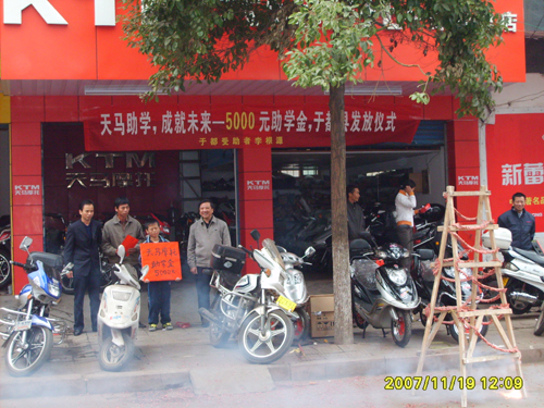 2007年12月20号,天马摩托山西办事处在山西长治为获得天马集团送出的助学金的两位幸运儿进行颁奖。