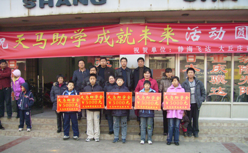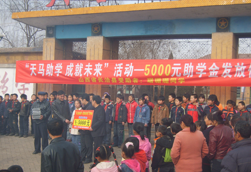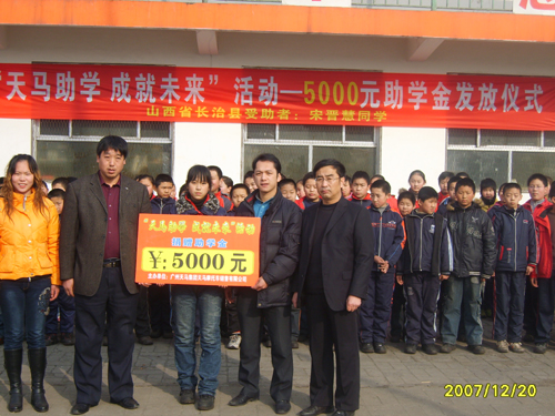 广州天马集团天马摩托销售有限公司遵循“百年育人”的古训,在山西省长治县金马摩托销售有限公司配合举办“天马助学,成就未来”捐资助学活动,于2007年12月20号在山西省长治县第五中学为宋晋慧同学发放助学金5000元,和在长治县荫城镇大峪村小学为琚珊珊同学发放助学金5000元,当地电视台现场采访播导了这次的天马摩托献爱心活动。除了向两位幸运儿发放助学金,还向两所学校的学生捐助了一批学习用品,两地的捐资助教发放活动受到当地师生和社会各界的好评,称赞广州天马集团发展不忘回报社会、心系教育、心系下一代的行为,热心支持教育事业,充分体现广州天马集团一直以来关注社会、热心公益事业的精神。也祝愿天马集团发展越来越强大。